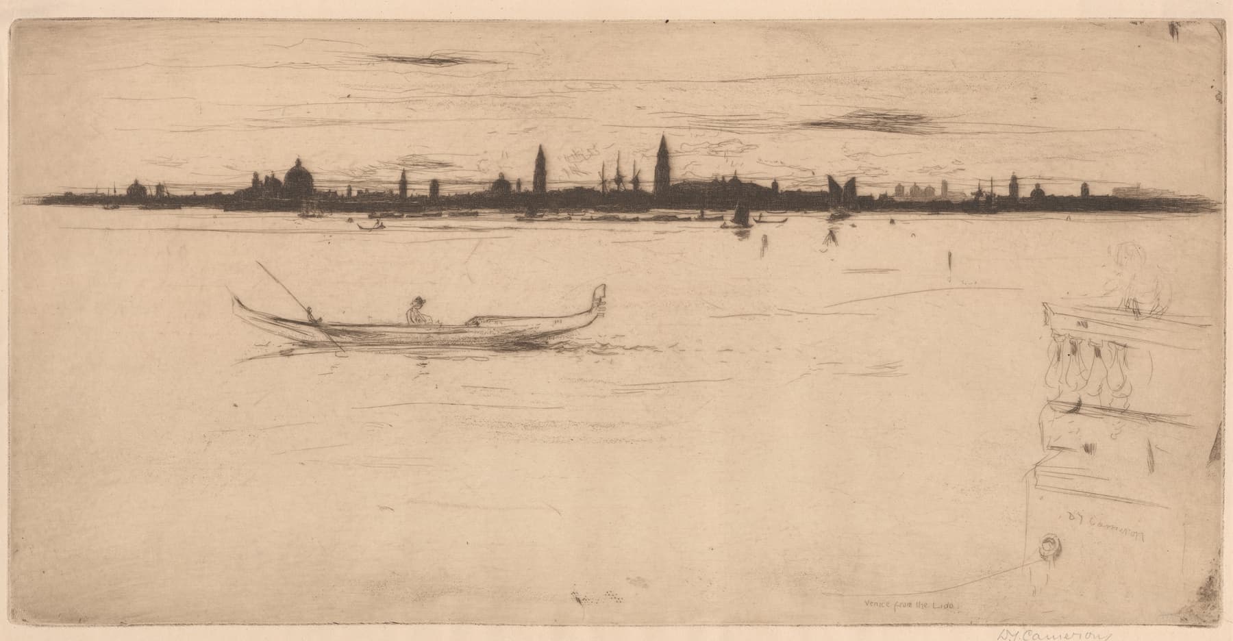 In this delicate etching from 1896, Cameron transports us to the edge of the Venetian lagoon. With masterful, minimalist lines, he depicts a lone gondolier gliding across the water, with the iconic silhouettes of Venice’s domes and campaniles shimmering on the distant horizon.